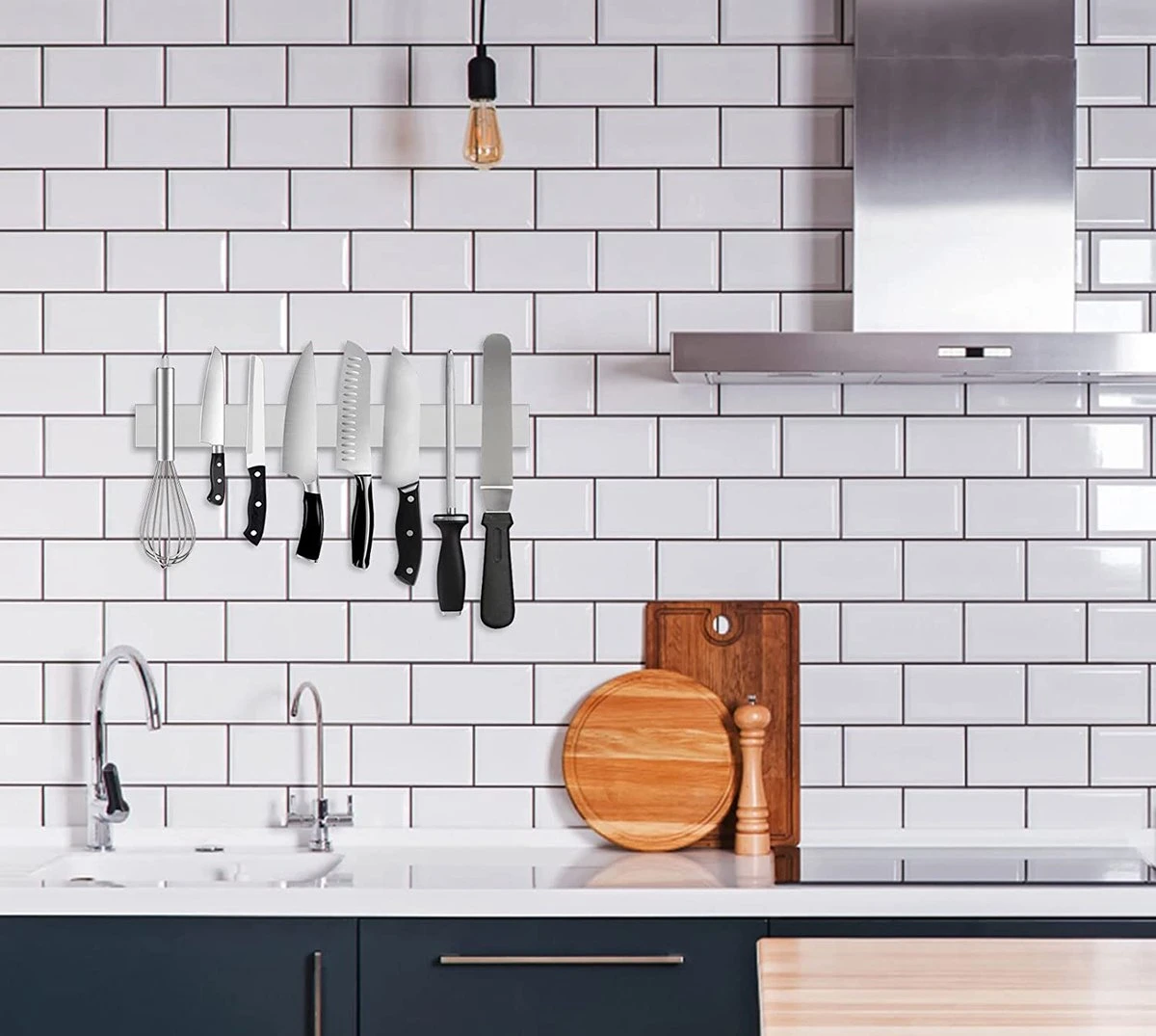 Hang jouw messen op een veilige en eenvoudige manier op zonder te boren met deze magnetische messenhouder. Deze messenhouder is veilig, praktisch en stijlvol. Het magnetische messenblok kan overal worden opgehangen, dus ook gemakkelijk buiten het bereik (hoog ophangen) van kinderen. In vergelijking met een keukenlade of messenblok is deze magnetische messenstrip hygiënischer, simpeler en sneller. Daarbij geeft deze messenhouder ook nog een stijlvolle, strakke en stoere uitstraling aan jouw keuken!
